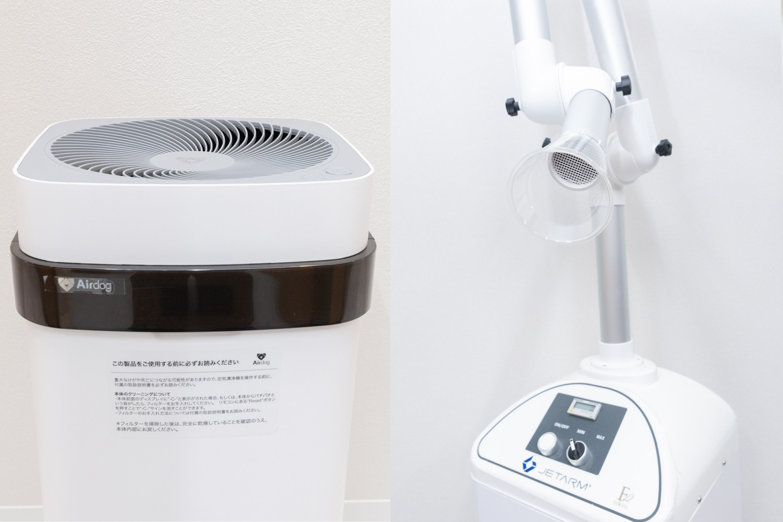 当クリニックでは、すべての患者さまに安心して治療を受けていただけるよう、衛生管理と感染対策を徹底しています。治療中に飛ぶ削りカスや血液、唾液を飛散しないよう「口腔外バキューム」で吸引し、受付や廊下にはエアドッグや高品質な空気清浄機を完備し換気、消毒を行っています。